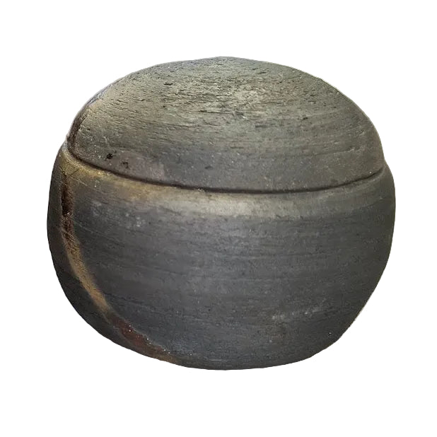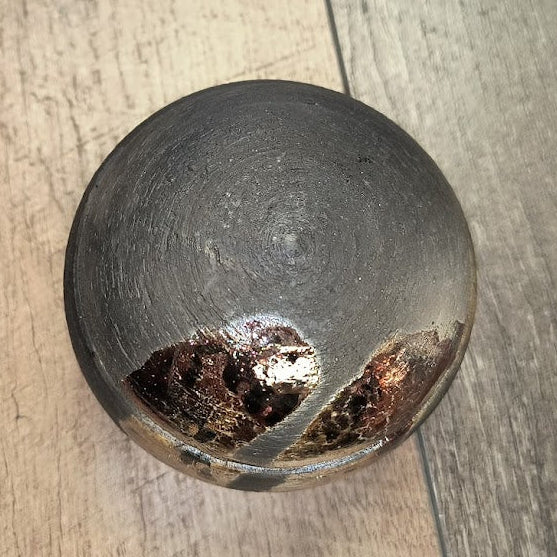 Overall, the piece balances weight and delicacy — the rounded silhouette feels solid and tactile, while the shimmering glaze throws the eye, giving the object a quiet, jewel-like presence. The deliberate imperfections in the metallic areas and the variation in sheen read like the traces of the maker’s hand and the kiln’s chemistry, making the jar feel both crafted and a little wild.