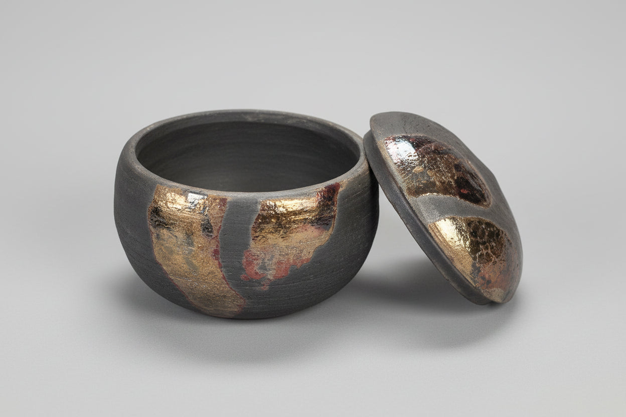 A low, squat ceramic jar with its lid tilted beside it. The body of the vessel is made from a dark, almost charcoal clay that gives it a somber, earthen presence. Band-like patches of highly reflective, metallic glaze — warm golds and bronzy coppers with flashes of pink and silvery highlights — streak across the exterior, catching and fragmenting the light so they look almost like burnished skin or patches of hammered metal laid against the matte body.