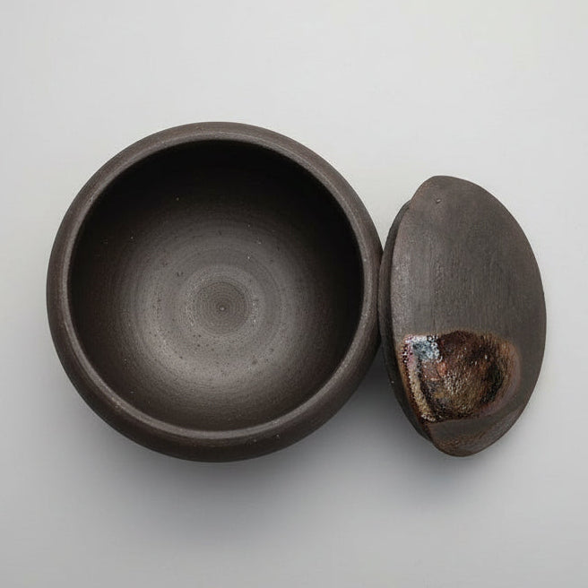 The lid echoes the same contrast: a smooth domed top with matching metallic patches, set against the darker ground. Where the glaze is dense it creates a mirror-like sheen; where it thins the dark clay peeks through, creating a textured, layered effect. Inside the jar the surface appears uniformly dark, suggesting a careful, inward finish that contrasts with the dramatic exterior decoration.
