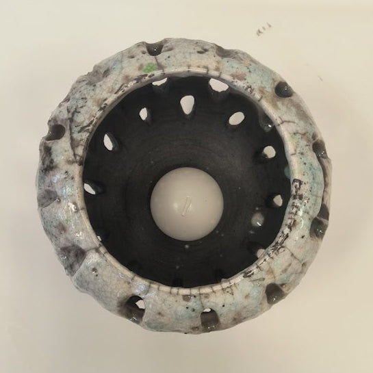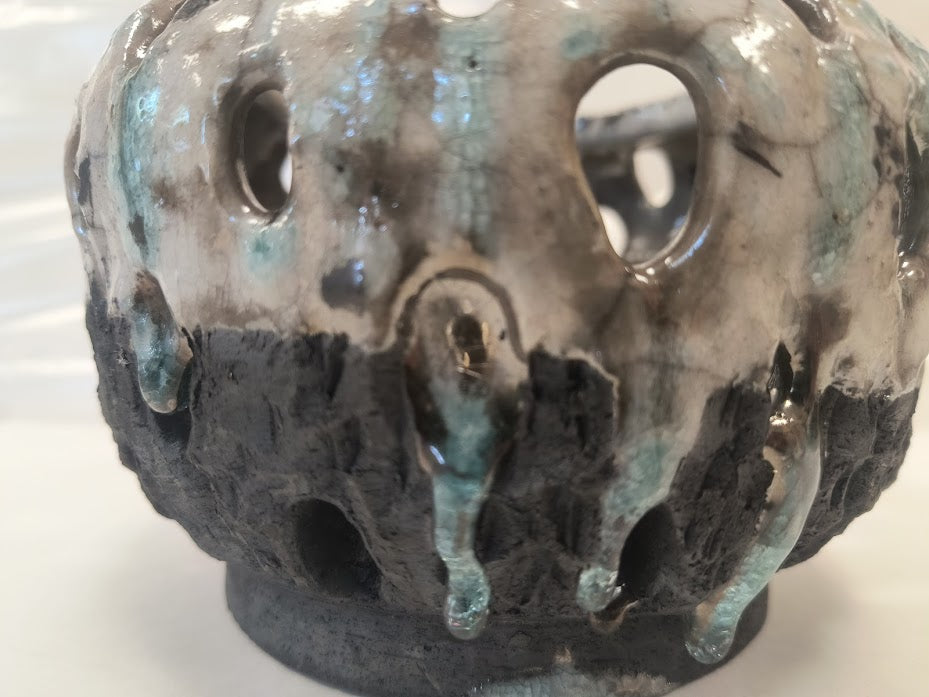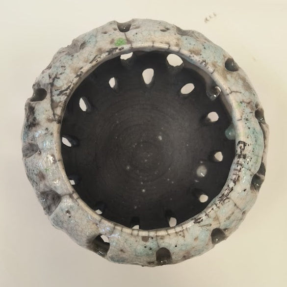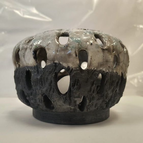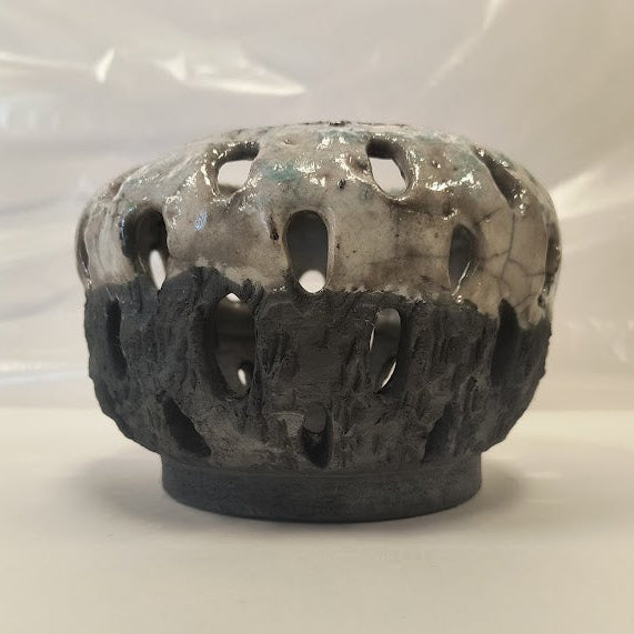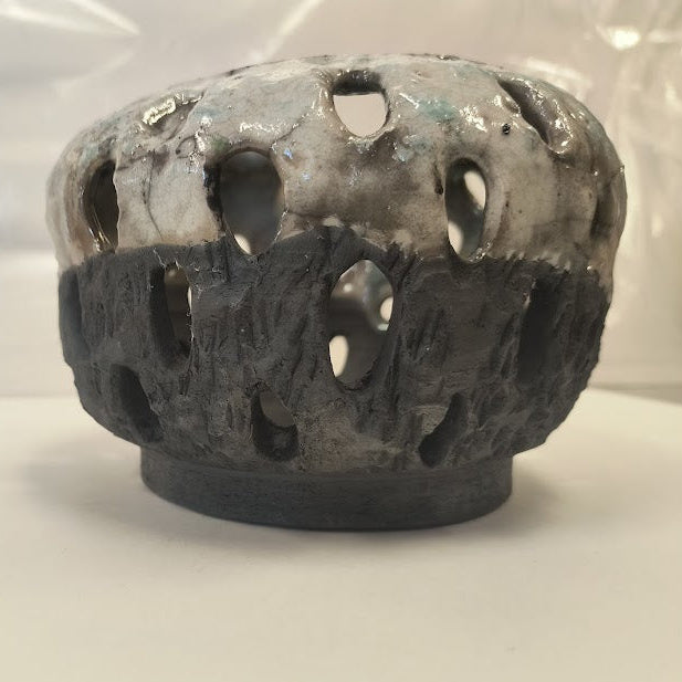 This piece could be seen as a modern or abstract take on traditional pottery, potentially used as a decorative lantern or a holder that casts playful shadows when illuminated from within, emphasizing the holes' pattern and adding depth to the visual experience. The ceramic's irregularities and color scheme lend it a contemporary aesthetic that bridges natural elements with artistic expression.