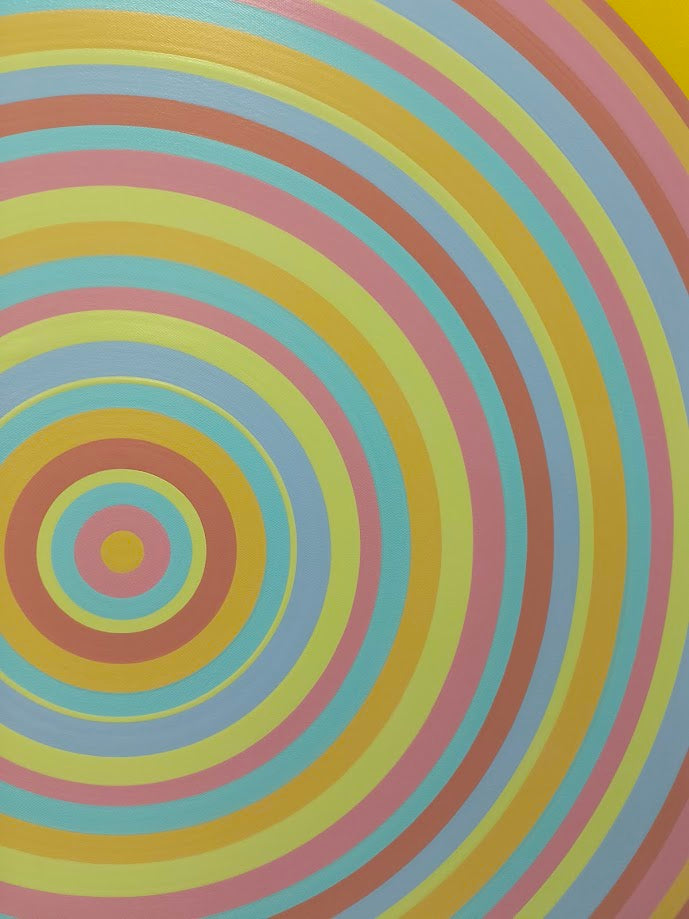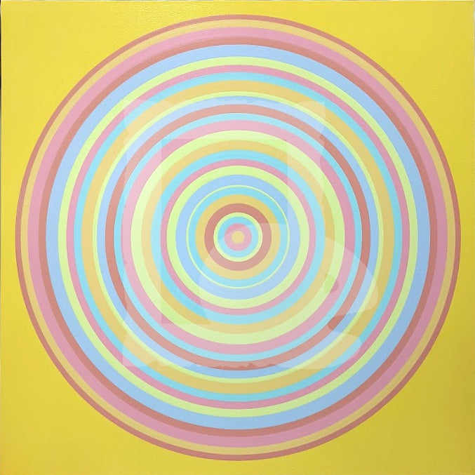 A perfectly centered bull’s-eye fills the square canvas: dozens of concentric rings ripple inward from a broad outer band to a small core, like the cross-section of some candy-colored tree. The background is a warm, saturated lemon yellow that makes the inner circles pop; the rings themselves alternate in a pastel palette — soft rose, powder blue, minty aqua, pale lavender and creamy peach — producing a gentle, rhythmic vibration. Each band is crisply edged and evenly spaced, creating a precise optical order that feels both mechanical and soothing. Up close the colors seem to hum against one another, the warm pinks and peaches balanced by the cool blues and greens, while from a distance the whole composition reads as a single luminous orb. The overall effect is meditative and playful at once: like a visual mantra or a retro target that invites you to stare and be pulled toward its calm, bright center.