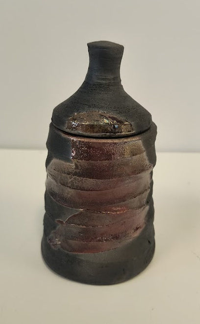 A small, hand-formed ceramic jar with its domed lid. The vessel is cylindrical and squat, roughly palm-sized, with visible concentric ridges on the inside and a slightly irregular rim that betrays a handmade process. The surface is matte and tactile rather than glossy — dark charcoal and sooty black merge into warmer, rusty-brown streaks and smudges, giving the piece a lived-in, wood-fired look. The lid is rounded with a short knob and shares the same smoky, uneven finish; its underside looks a touch lighter where it would meet the rim.