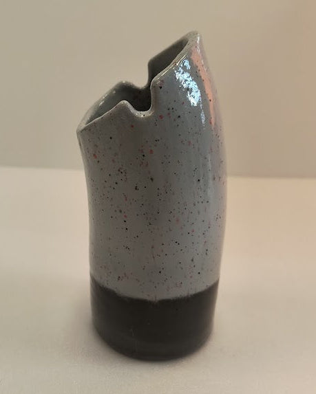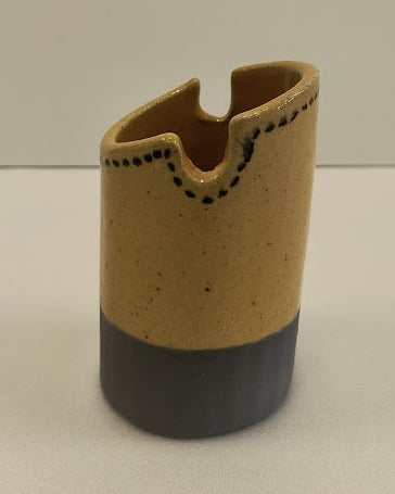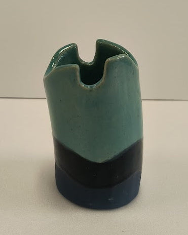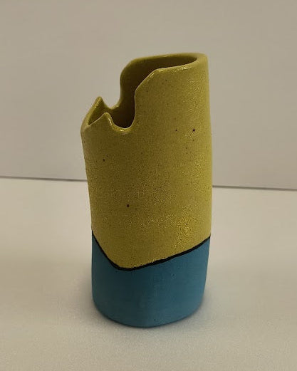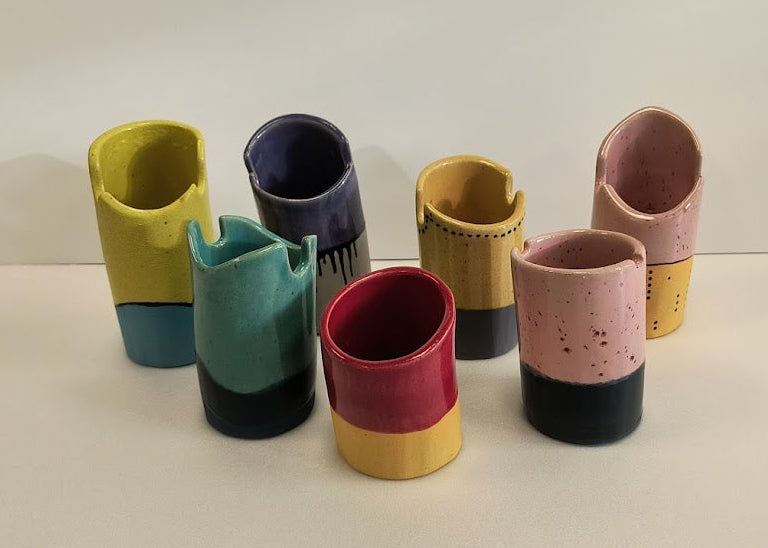 Each piece is color‑blocked: pastel or saturated tops (lemon yellow, teal, deep indigo/purple, mustard, coral red, soft pink) paired with darker lower bands — several with a matte black or navy base — and one with a thin yellow foot. The rims are slightly irregular, with a few notches and uneven edges that give them a handmade, ceramic feel; tiny speckles and faint drips in the glaze catch the light. Visually they read like a set of playful, modernist totems — the contrast of bright upper colors and darker bases creates a sense of grounding and personality for each piece. Artistically they suggest craft, color theory play, and a friendly, minimalist sculptural language.