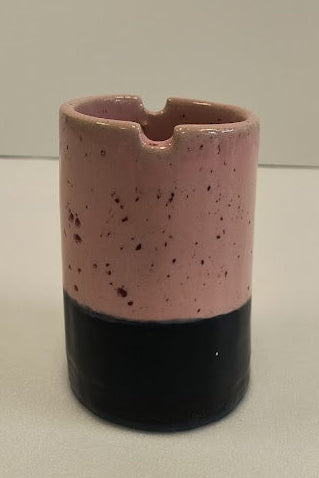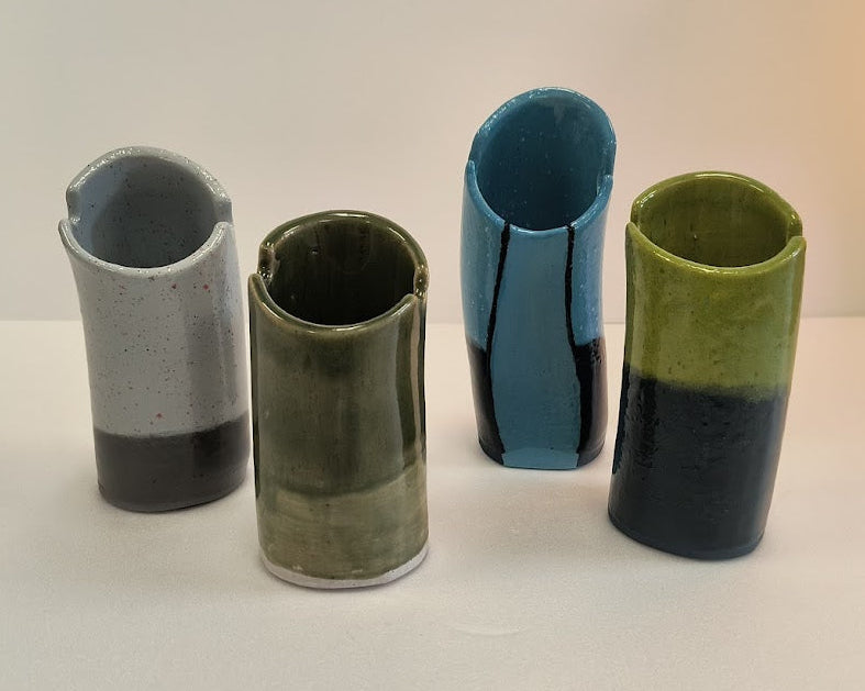 These are 10 different paintbrush holders. Lyn has made them so the majority have a little ridge you can lay a paintbrush in, but you can also store paintbrushes vertically in them. If you put water and soap into the holder, she has added ridges to the bottom of the cups to more easily scrub your brushes with.