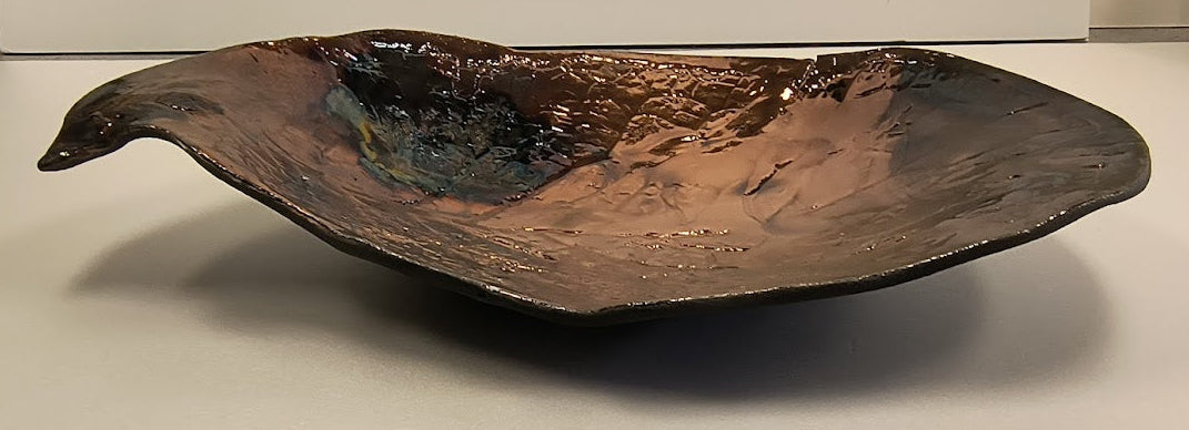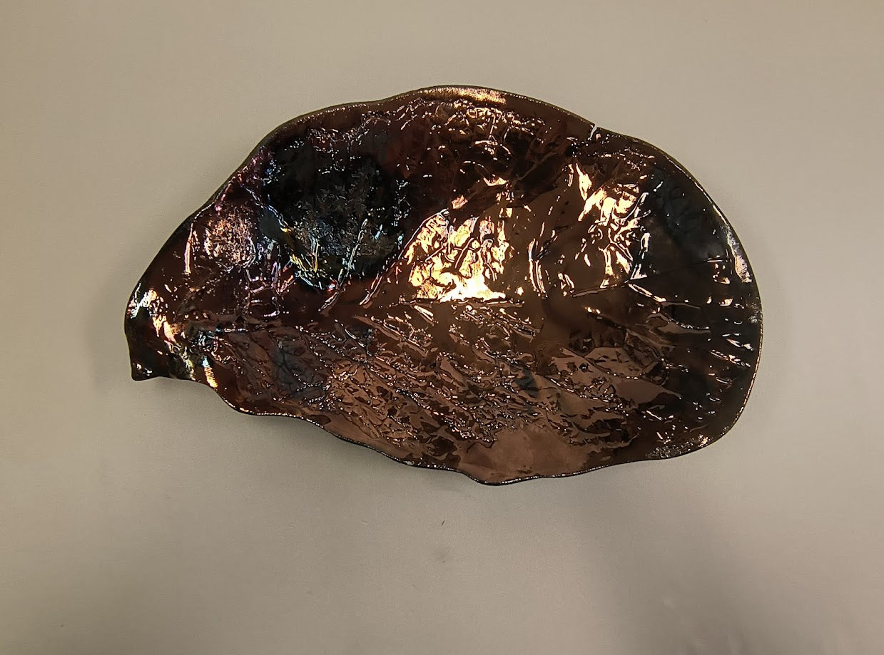 A low, leaf-shaped dish, its edges irregular and slightly curled like a real dried leaf. The interior has a glossy, almost metallic sheen — deep bronze and black tones catch the light and pick out a faint pattern of veins and tiny imperfections that give it a handcrafted, pottery-like feel. One end tapers to a little pointed tip while the other is broader and gently scooped, and a soft shadow beneath hints that it’s shallow and lightweight. Overall it feels organic and artful, like a small sculptural tray or decorative platter.