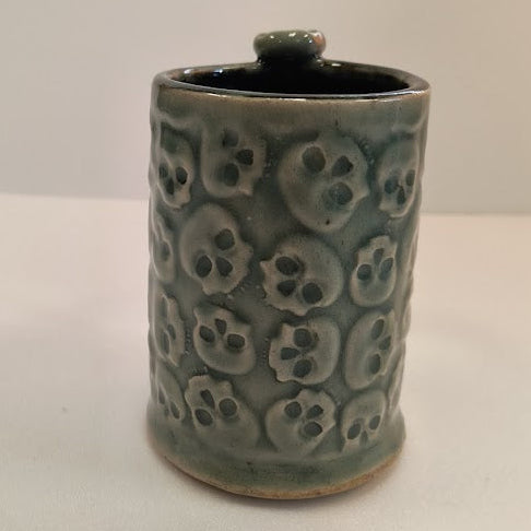 A small, hand‑made ceramic mug. Its surface is covered in a muted sea‑green/gray glaze that pools slightly in the recessed areas, giving a soft, variegated sheen. The body is decorated with a repeating relief pattern — roughly coin‑sized motifs that are stylized skulls, arranged in neat vertical rows. The raised pattern catches light on the ridges while the indentations stay darker, emphasizing the texture.