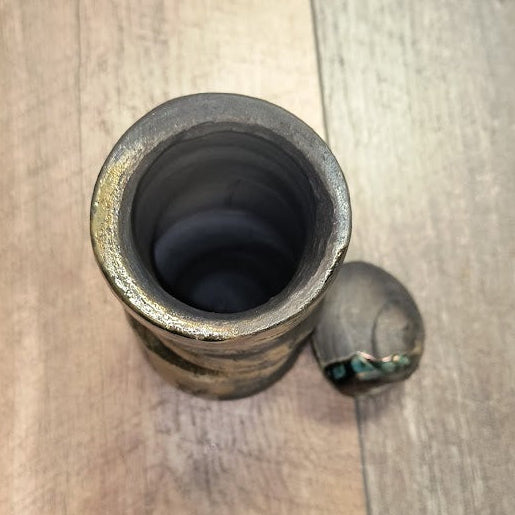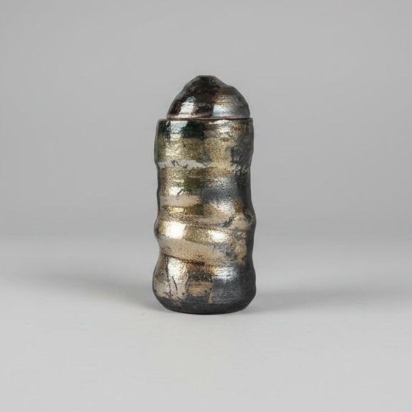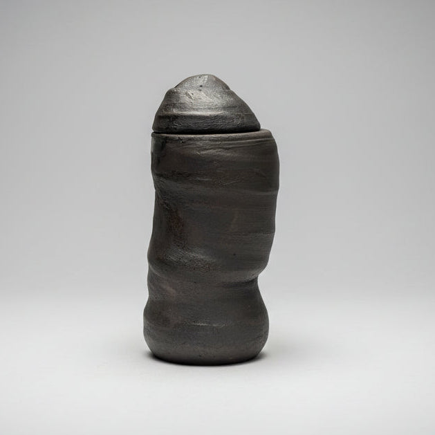 A small, hand-formed vessel. It is roughly cylindrical but irregular — its sides swell and pinch in places, giving it an organic, almost ribbed silhouette. The top is rounded, like a little dome or cap that blends into the body rather than ending in a sharp edge.