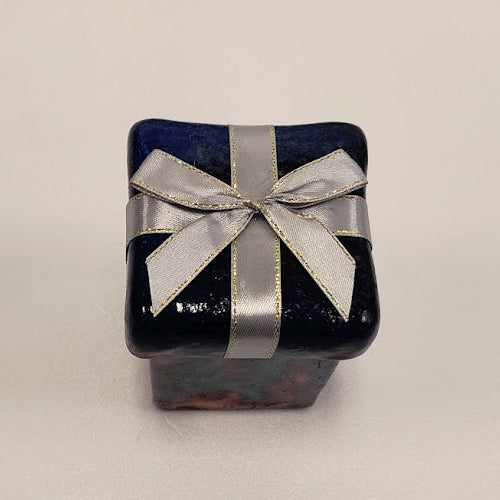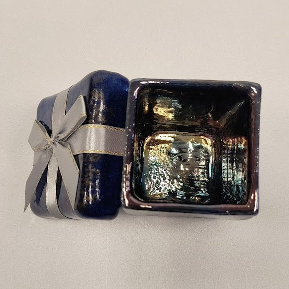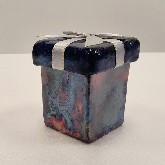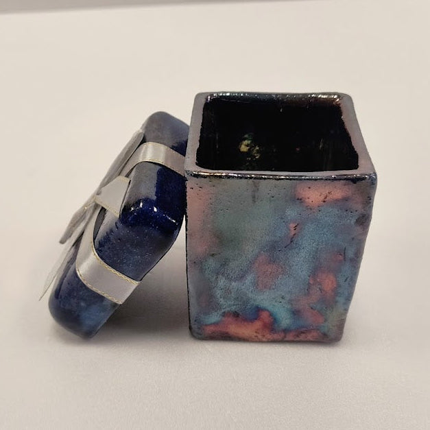 A small, square container its lid removed and propped beside it. The box is roughly palm-sized — you can tell from the scale that it would hold a ring or a few small trinkets. Its exterior has an iridescent, mottled finish: pools of turquoise, rose, purple and copper blend and shift across the flat sides, giving the piece a worn, almost meteor-like patina. The colors are soft where they mix and more vivid along edges and corners.