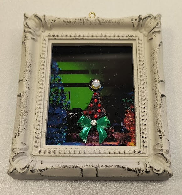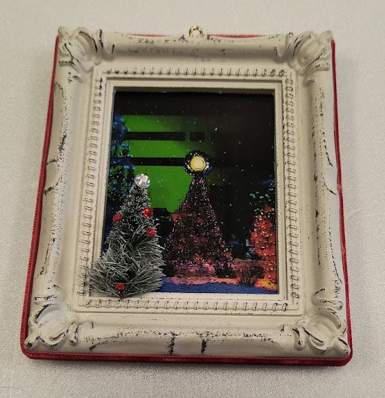 These ornaments are photographs that Brenda has taken of the Red Deer downtown in various ways and has then put into little white frames, she has attached a loop of ribbon to the top of the little frame that the ornament can hang from. They are a very classy look and a great gift to give.